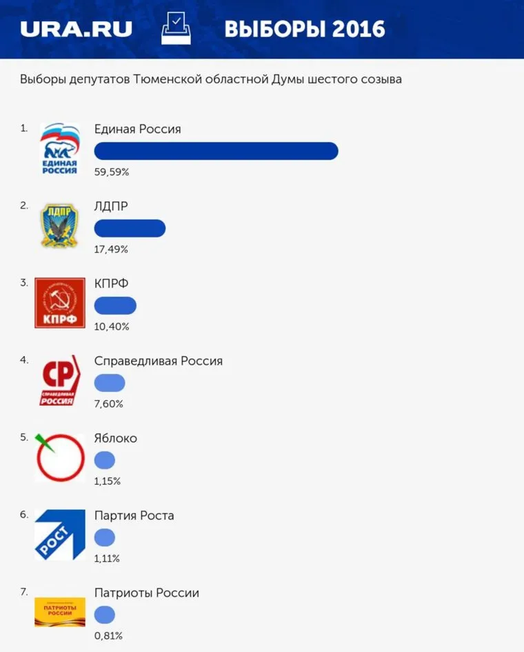 Предварительные результаты выборов в Тюменскую областную думу по партийным спискам. «Единая Россия» празднует сокрушительную победу