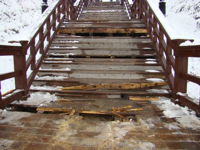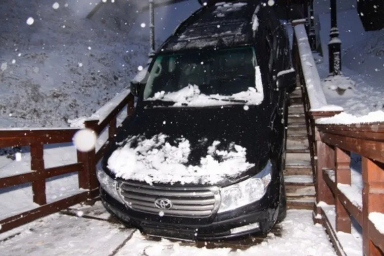 По данным источника «URA.RU», водитель джипа проехал вниз по спуску до конца его мощеной части, но подняться обратно трехтонная машина не смогла из-за выпавшего легкого снежка. После этого водитель джипа решил спуститься по лестнице, но автомобиль застрял, когда деревянная конструкция начала разрушаться под его весом.
