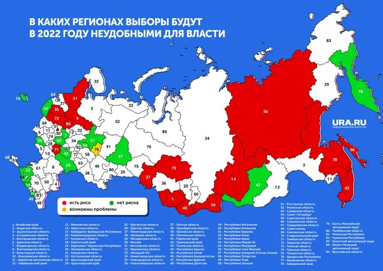 Как пояснил источник URA.RU, в алтайских регионах, Карелии, Вологодской области, Приморском крае и Якутии «существуют конфликты элит», в Новгородской переизбирается губернатор, но «позиции у него непростые», в Тамбовской области «усилилось напряжение» после внезапной отставки экс-губернатора Александра Никитина и назначения врио Максима Егорова — есть риск, что тот «не успеет выстроить отношения с элитами».