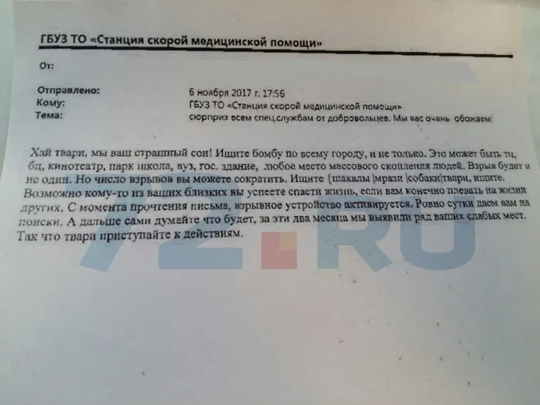 «Ищите бомбу по всему городу, и не только. Это может быть тц, бц, кинотеатр, парк, школа, вуз, госздание, любое место массового скопления людей», — говорится в анонимке. Авторы предупредили, что «за два месяца выявили ряд ваших слабых мест».
