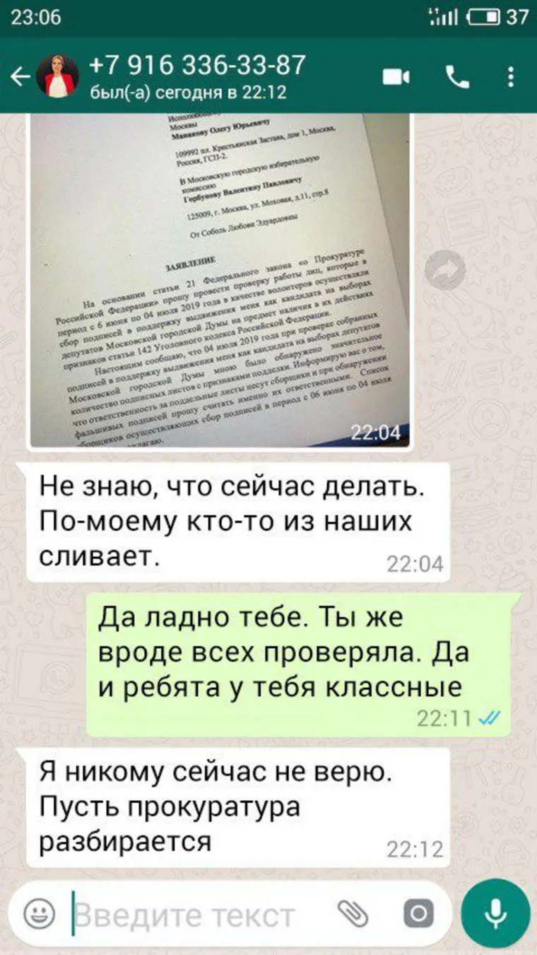 5 июля в telegram-каналах появились новые сообщения — о подделке документов. В этот раз речь идет о том, что юрист Навального готовит обращения в прокуратуру на предмет подлога избирательных документов сборщиками, чтобы скрыть фальсификацию подписей. На появившихся в соцсетях скриншотах видно, как Соболь якобы демонстрирует собеседнику в WhatsApp письмо силовикам с просьбой проверить работу волонтеров. «Не знаю, что сейчас делать. По-моему кто-то из наших сливает, — пишет кандидат. — Я никому сейчас не верю. Пусть прокуратура разбирается».