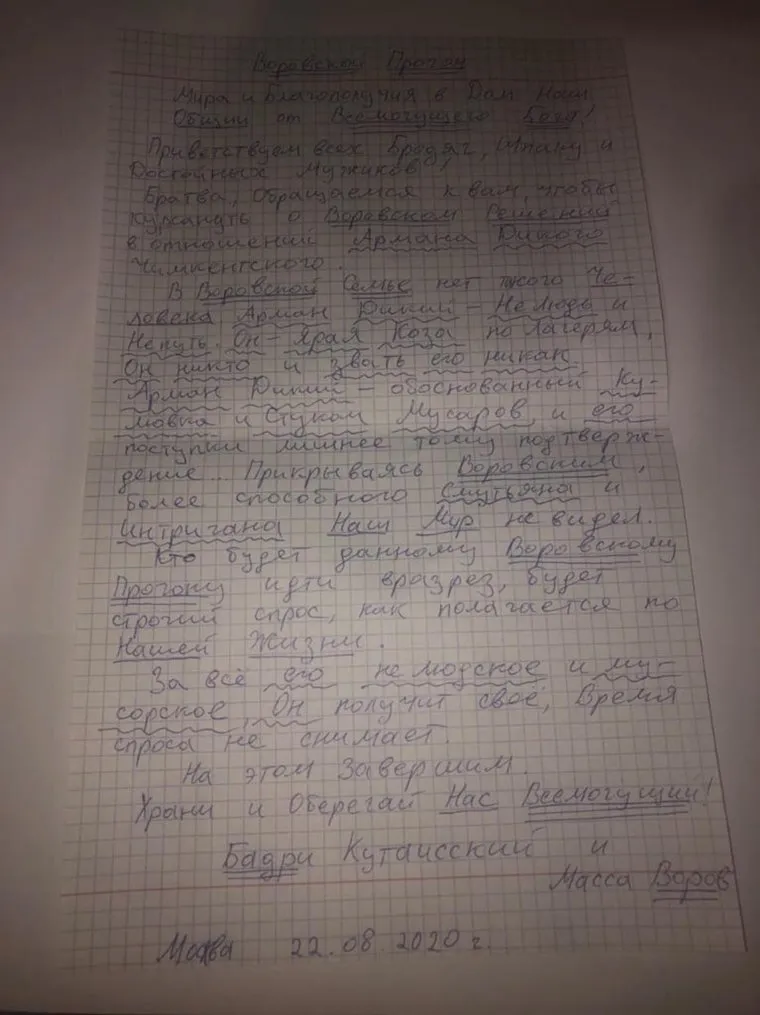 Вор в законе Бадри Когуашвили по кличке Бадри Кутаисский сделал выпад в адрес одного из ближайших соратников убитого Надира Салифова по прозвищу Гули. Силовики перехватили так называемый воровской прогон Бадри, снимок «документа» URA.RU предоставил источник в правоохранительных органах. В прогоне Бадри пишет об Армане Джумагельдиеве по кличке Арман Дикий. Арман известен тем, что контролирует всю контрабанду через границу со стороны Казахстана через Урал.