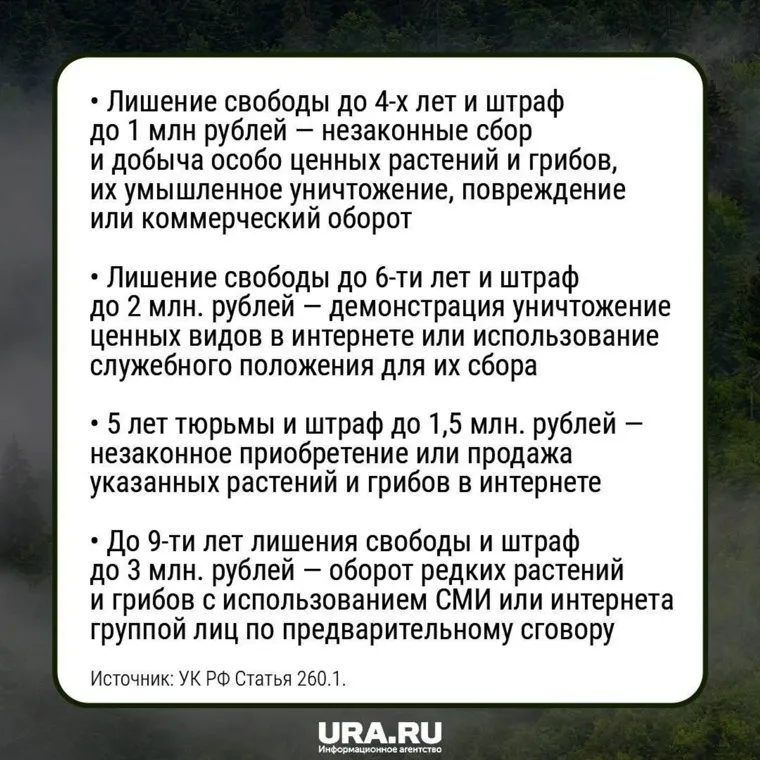 «Нарушителю грозит наказание в виде обязательных работ до 480 часов либо до двух лет исправительных работ или лишение свободы на срок до четырех лет со штрафом до миллиона рублей», — сообщили в Минприроды. Это может произойти в случае незаконной добычи, сбора, приобретения, хранения и продажи трех видов грибов — гиднеллум Пека, Паутинник фиолетовый и Гериций (Ежовик)коралловидный, которые растут на территории региона.