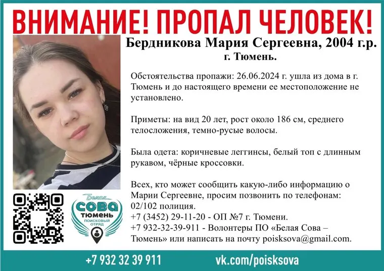 «Мария Бердникова 2004 года рождения. Она 26 июня ушла из дома в Тюмени и до настоящего времени ее местоположение не установлено», — написали поисковики в группе во «ВКонтакте».