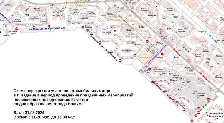 В Надыме 30 августа с 15:00 до 23:00 и 31 августа с 13:30 до 23:00 закроют движение по проезду от проспекта Ленинградского до Набережной имени Оруджева, первую часть дороги Бульвара Стрижова и по проспекту Ленинградскому. Кроме того, 31 августа с 11:30 до 13:30 закроют движение по Набережной имени Оруджева и по улице Рыжкова.
