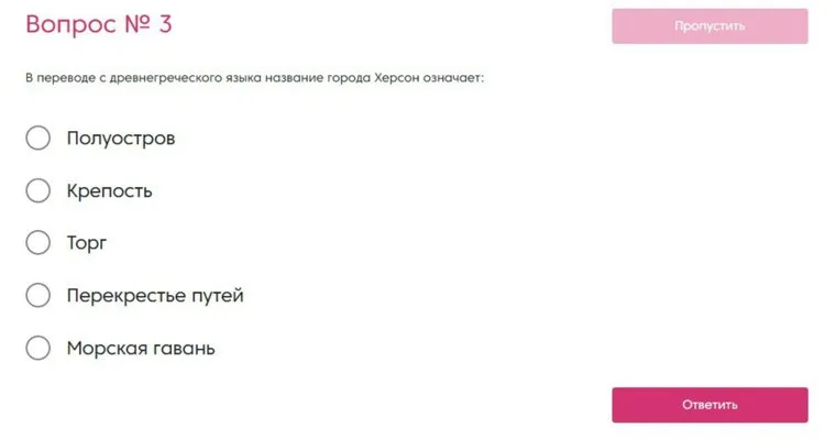 «Как с древнегреческого переводится название города Херсон? Варианты ответа: полуостров, крепость, торг, перекрестье путей или морская гавань», — это вопрос под номером три в списке основных в Большом этнографическом диктанте. В основные задания входят общие для всех темы, а «переменная» часть вопросов разнится в зависимости от того, в каком регионе россияне пишут диктант.
