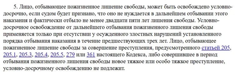 «Лицо, отбывающее пожизненное лишение свободы, может быть освобождено условно-досрочно, если судом будет признано, что оно не нуждается в дальнейшем отбывании этого наказания и фактически отбыло не менее двадцати пяти лет лишения свободы. Условно-досрочное освобождение от дальнейшего отбывания пожизненного лишения свободы применяется только при отсутствии у осужденного злостных нарушений установленного порядка отбывания наказания в течение предшествующих трех лет», — сообщается в части 5 ст. 79 УК РФ.