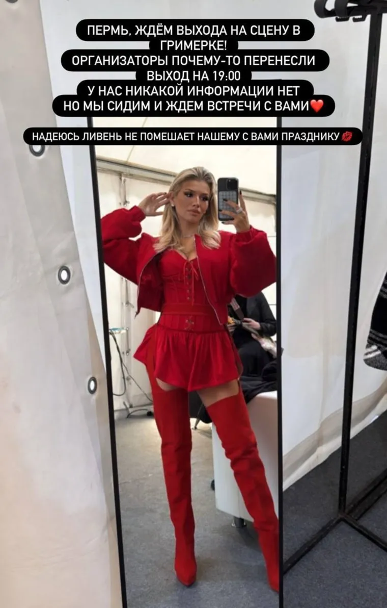 18:42 Люся Чеботина в своих соцсетях сообщила, что концерт перенесли на 19:00. Она ждет своего выхода на сцену не меньше, чем пермяки. Также певица опровергла слухи о том, что у нее проблемы с голосом.