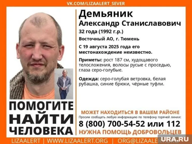 «Демьяник Александр Станиславович, 32 года, Восточный АО, город Тюмень. С 19 августа 2025 года его местонахождение неизвестно», — сообщается в ориентировке волонтеров.
