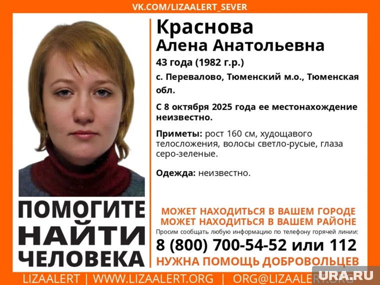 «Пропала Краснова Алена Анатольевна, 43 года, село Перевалово, Тюменский район, Тюменская область. С 8 октября 2025 года ее местонахождение неизвестно», — пишут в посте.