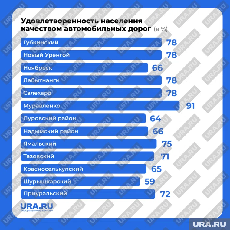 На втором месте по уровню удовлетворенности — Губкинский, Новый Уренгой, Лабытнанги и Салехард. Здесь качество дорог положительно оценили 78% участников опроса. Остальные города и районы региона получили более низкие оценки.