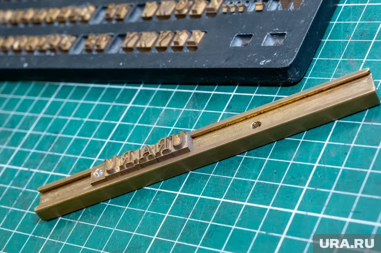 Пока браслет сохнет, определяемся со штампом: буквами, цифрами, рисунком. Мы решили отпечатать на браслете надпись «URA.RU», поэтому выбираем две буквы «U», две — «R», одну — «А» и точку. Кладем их на клише в зеркальном порядке и собираем на планку. Проверяем, чтобы надпись на планке была ровно по центру.