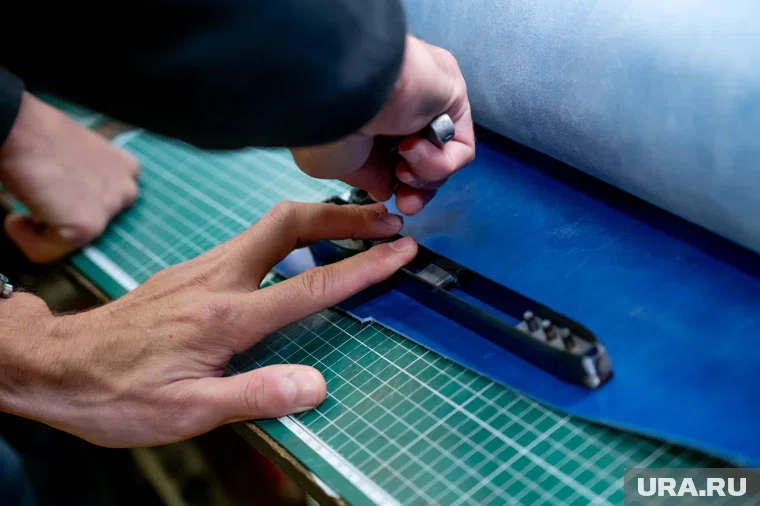 Под чутким руководством Никиты корреспондент URA.RU решил изготовить браслет на руку. «Браслеты и брелоки, это самые простые в изготовлении аксессуары», — объясняет Никита. Материал для изготовления аксессуара подбирается, исходя из того, какое изделие необходимо сделать. В нашем случае для браслета потребуется кожа толщиной 1,8-2,2 мм. Мастер предлагает на выбор кожу нескольких цветов. Останавливаем свой выбор на синем цвете — «корпоративном» цвете URA.RU.