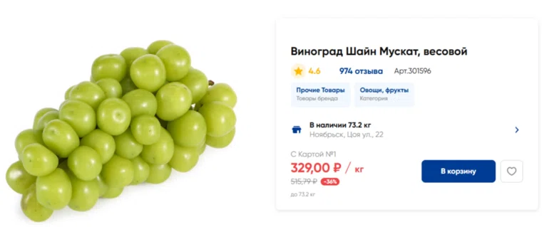 Как сообщают в гипермаркете «Лента» в Ноябрьске, стоимость винограда сорта «Шайн Мускат» снизилась с 515 рублей до 329 рублей за килограмм. В магазинах ритейлера «Магнит» розничная цена на эти плоды держится на уровне 360 рублей.