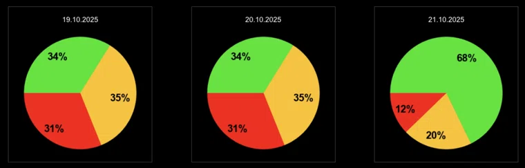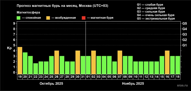Согласно предварительным расчетам, октябрь завершится относительно спокойно. После всплеска 20 октября следующая активность прогнозируется лишь 26 и 30 октября — в эти дни возможно кратковременное возбуждение магнитного поля.