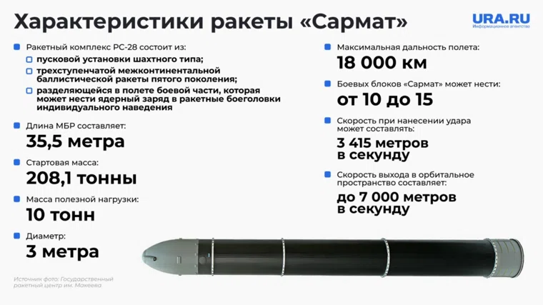 Комплекс «Сармат» укомплектован тяжелой межконтинентальной баллистической ракетой, масса которой превышает 200 тонн. Она способна преодолевать расстояние до 18 тысяч километров. Согласно информации Минобороны, изделие имеет короткий активный участок полета, что значительно осложняет возможность ее перехвата системами противовоздушной обороны.