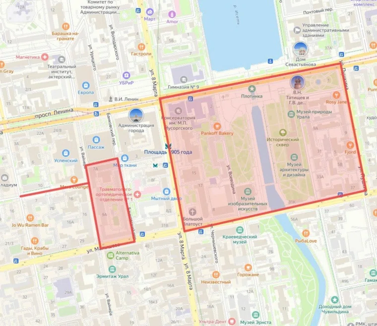«Приобрести спиртное с 8:00 до 23:00 нельзя будет 31 декабря и 1 января, а также 6 и 7 января: в границах улиц Малышева — 8 Марта — проспекта Ленина — Пушкина; Малышева — Вайнера — переулка Театрального — переулка Банковского; по улице Попова — от Вайнера до Хохрякова», — сообщает пресс-служба. При этомкаток на площади 1905 года и квартал улиц Антона Валека — Вайнера — 8 Марта — Ленина в зону ограничений не попадают.