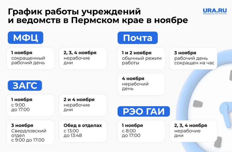 Как в праздничные дни ноября работают почта, МФЦ и ЗАГС в Пермском крае. Инфографика