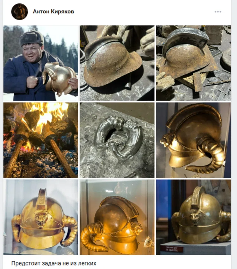 Кузнец из Кунгура Пермского края Антон Киряков решил воссоздать шлем, который разыскивали герои знаменитой комедии «Джентльмены удачи». Для этого мастер намерен переделать пожарную каску.