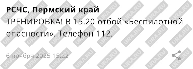 В Пермском крае завершилась тренировка по беспилотной опасности в 15:20 6 ноября. Сообщение об этом поступило от РСЧС.