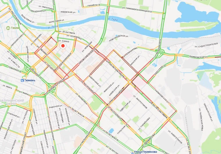 В Тюмени центр парализован пробками: «стоят» Ленина, Челюскинцев, Герцена и другие улицы. Также заторы наблюдаются и дальше, на восток города. Данные представлены на сервисе «Яндекс Пробки».