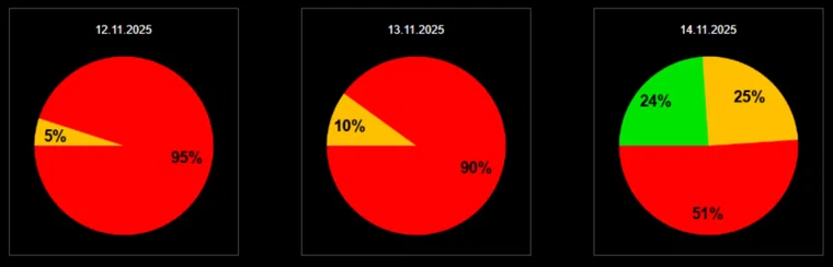 Согласно проведенным расчетам вероятностей и оперативным прогнозам, вероятность возникновения мощного геомагнитного шторма 13 ноября составляет около 90%. Существует лишь 10%-я вероятность того, что уровень геомагнитных возмущений не превысит «оранжевый» уровень. В четверг спокойная геомагнитная обстановка исключена.