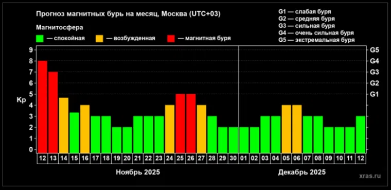 Согласно данным Лаборатории солнечной астрономии 13 ноября 2025 года прогнозируется возникновение геомагнитного возмущения значительной силы. С вечера 11 ноября зафиксировано повышение уровня активности магнитосферы до «красного» уровня. Метеозависимым рекомендуется проявлять бдительность и придерживаться профилактических мер. Подробнее о прогнозе — в материале URA.RU.