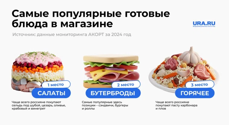— Салаты стали самой популярной готовой едой в магазинах, наиболее предпочитаемые из них — сельдь под шубой, цезарь и оливье, следует из данных мониторинга АКОР за 2024 год. На ваш взгляд, почему их покупают чаще других готовых блюд? Какие еще позиции популярны?